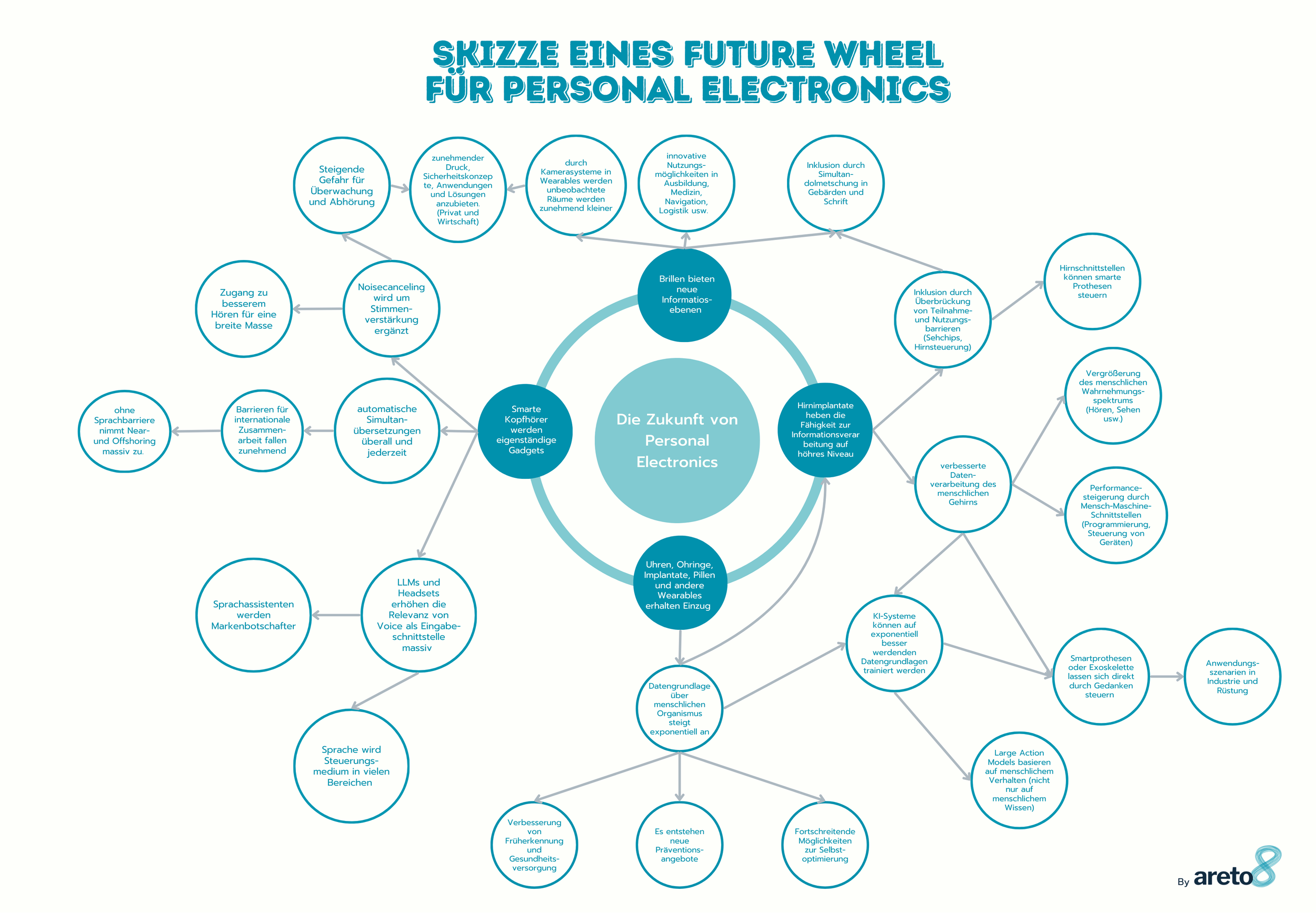 Wenn man antizipieren will, wohin die Entwicklung der Personal Electronics führen könnte, lohnt es, die beschriebenen Phänomene und Entwicklungen weiterzudenken. Wie kann die weitere Integration der Geräte und Funktionalitäten gelingen? Welche Sinne lassen sich durch Digitalisierungs- und Vernetzungsmaßnahmen zukünftig besser oder intensiver ansprechen? Was geschieht, wenn Geräte nicht nur am Körper, sondern zunehmend im Körper getragen werden? Welche Daten Daten entstehen dann und wie welche können Künstliche Intelligenzen, die damit trainiert werden? Um sich Fragen solcher Art systematisch und geordnet zu nähern, haben wir ein Future Wheels für die Zukunft der Personal Electronics erstellt.